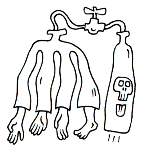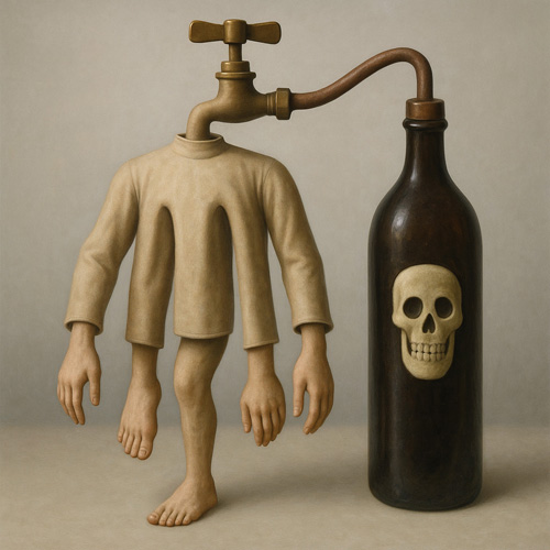 一体の人型の存在が、天井から伸びる蛇口によってぶら下げられ、隣に立つ黒いボトルと管でつながれている。そのボトルには不吉な意匠──笑う髑髏のエンブレムが浮かび上がり、内容物の危険性を仄めかしている。身体には三本の腕と一本の足がぶら下がり、どこにも頭部は存在しない。まるでその器は、身体というよりも「道具」であり、内部に何かが注ぎ込まれ、作用するための構造に見える。