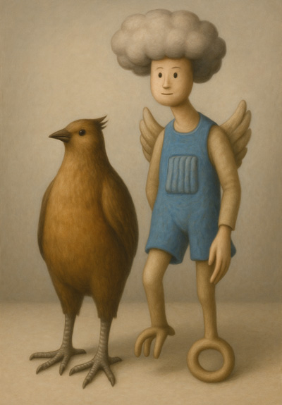 「鳥であるのに飛ばず、歩かず」「人であるのに翼をもち、足も不完全」という二者の並びは、機能や役割から解放された存在の静かな並立を示している。意味を問うことを拒みながら、そこに“在る”ということの不可思議さと自由を体現するような一作である。