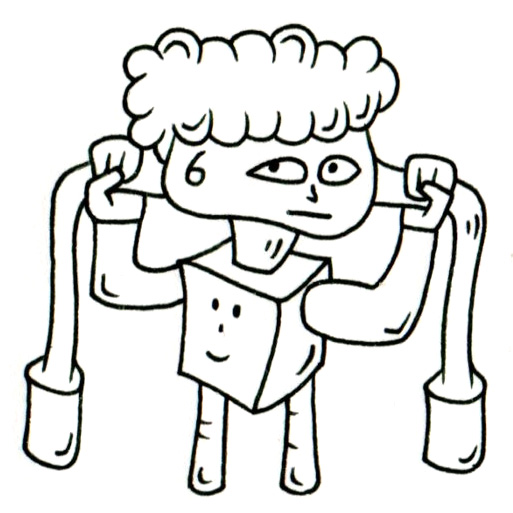 直立するこの存在は、立方体の胴体に笑顔を浮かべたアイコンを抱え、太くたくましい腕で左右のコード状の物体を引き上げている。その表情はどこか厳しく、集中した面持ちをたたえているが、足元を見ると、その脚は現実の肉体ではなく、滑らかに削られた木の棒で構成されている。