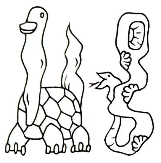 画面に立つのは、左に「亀の甲羅をもったアヒルのような存在」、右に「眼を内包した蛇のような柱状の存在」。両者は似て非なるシルエットで、奇妙なほど静かに共に立っている。その間には対話もなく、敵意もない。ただ並んで、そこにいる。