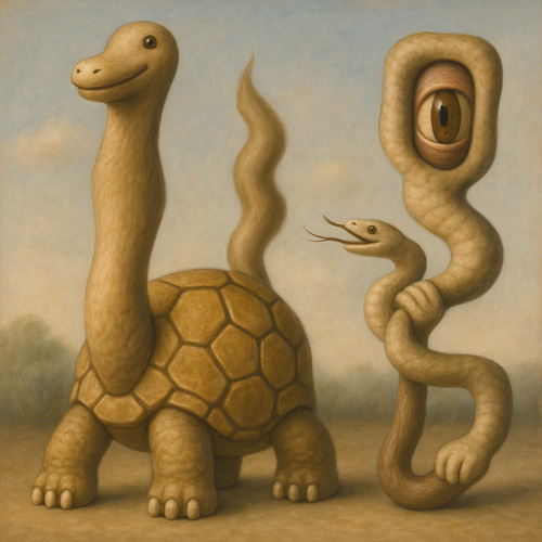 亀のような存在は、ゆっくりとした時の象徴であり、地に根差した堅牢な記憶のようでもある。一方、右の存在は視線と蛇の舌を持ち、周囲を探るような敏感な知性を象徴しているようだ。ふたつはあたかも「身体」と「感覚」、「鈍重」と「鋭利」、「思考の速度の違い」を表しているかのようである。