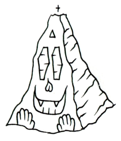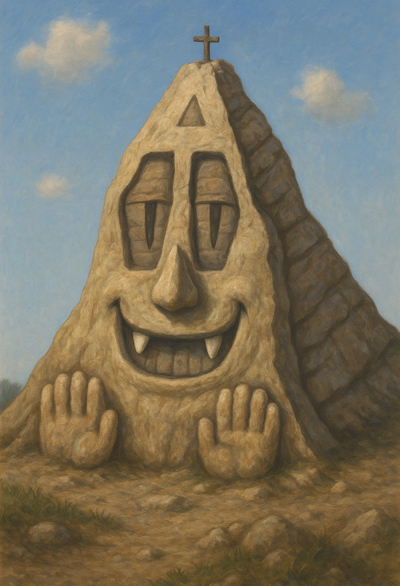 この作品は、山そのものが人格を帯び、地形が意志を持つ存在として描かれている。十字が刻まれた頂には宗教的象徴性が垣間見えつつも、全体はどこかユーモラスで親しげな表情を湛えている。瞼の重い目、誇張された牙、そして両手を差し出すようなポーズは、自然が人間的記号を吸収しながらも、それを超えて異質な存在へと変容していく過程を示唆している。