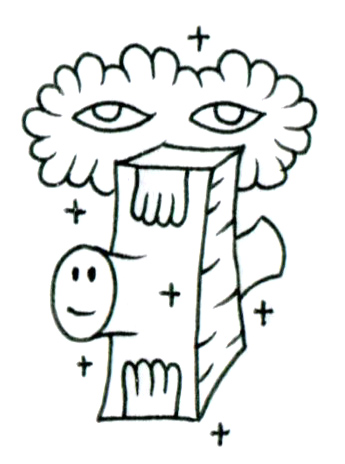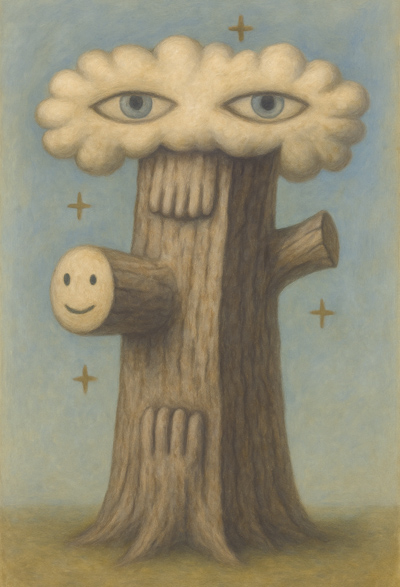 この作品では、一本の木が複数の視線と手を持ち、観察される存在であると同時に観察する主体でもあることが示唆されている。頭部のように広がる雲状の葉に刻まれた目は、天体を想起させる星々に囲まれながら、空と地上のあいだを見つめている。