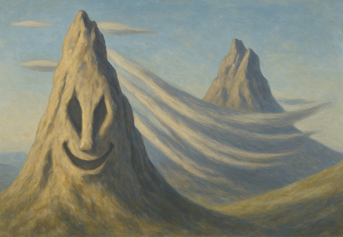 山が顔を持ち、感情を帯びた存在として現れることで、風景は単なる自然ではなく、無意識に満ちた対話の場へと変わっている。もう一方の山は静かにそれを見つめており、ふたりの間に流れる風は、視線や声なき対話の軌跡のようだ。