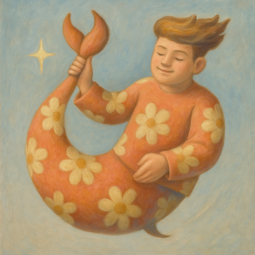 まるで空中を漂うようなこの存在は、人魚でも神でもなく、どこかで眠りかけている無意識の一形態のように見える。満ち足りた表情と、花模様に包まれた身体のしなやかな曲線は、感情や性別、時刻さえも超越している。