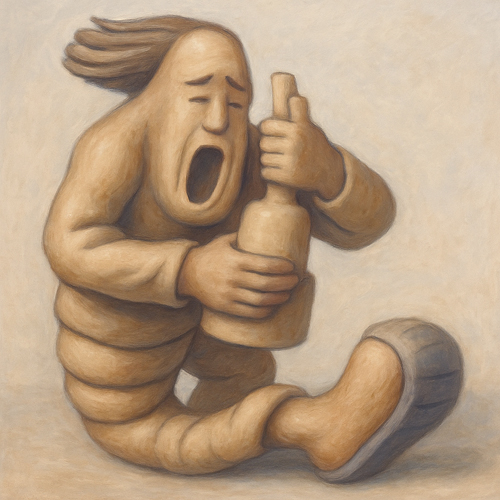 瓶は武器ではなく、支えでもなく、ただの対象として両腕の間にある。その距離感は、感情と物体の関係、あるいは「言えないもの」との接し方を象徴しているかのようだ。