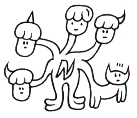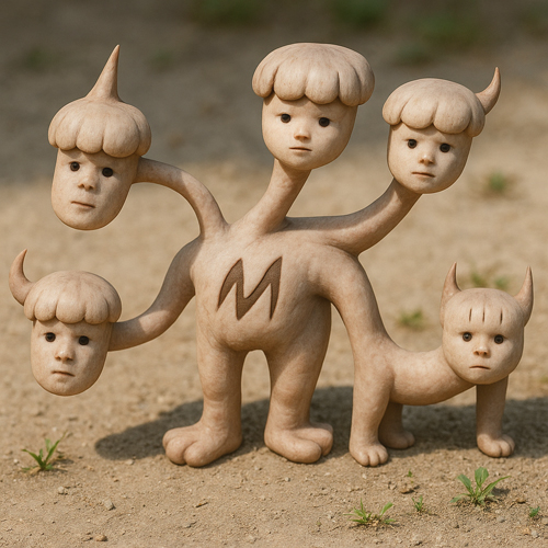 砂地に立つ奇怪な生命体は、五つの異なる顔を持つ存在。すべての頭部が均一に無表情で、同じ髪型をもちながらも、角や向きに微妙な違いがある。中央の胴体には雷のような「M」の刻印が浮かび、全体として擬人化された動物のようでもある。どの顔も互いに干渉せず、まるでそれぞれが独立した人格を秘めたまま沈黙しているようだ。名もなき存在たちの静かな共生と、語られぬ孤独を象徴している。