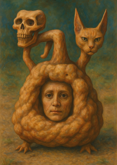 異なる記号が一つの肉体から生まれ、無秩序にも見える構成の中で均衡を保っている。頭上には骨と猫という、生と死、理性と野性を象徴する二つのイメージが浮かび、その間からは人の手が中空を指すように現れる。