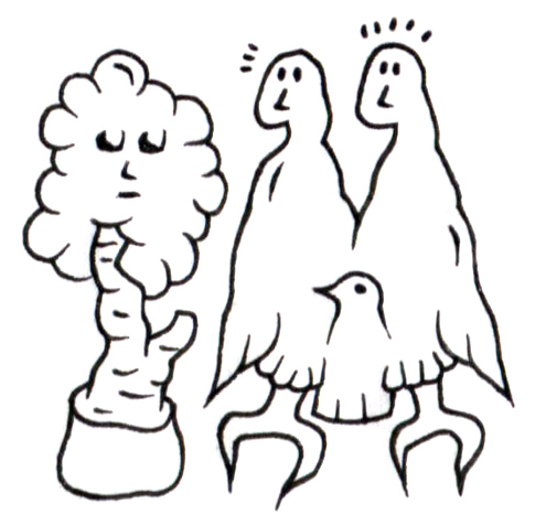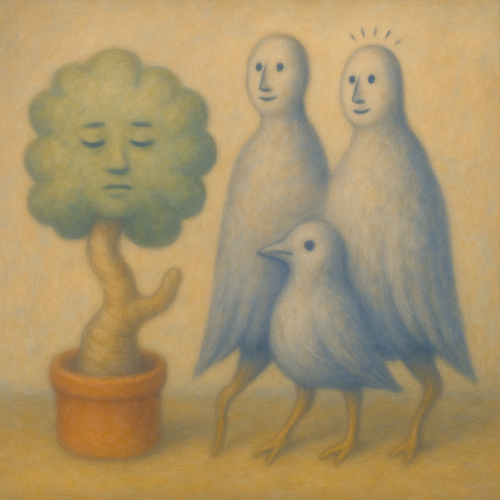 鉢植えの樹木は、人の顔を湛えたまま静かに目を閉じ、傍らには鳥と人のあいだを揺らぐ三つの存在が立ち並ぶ。彼らは羽を持ちながらも人の表情を持ち、まるで別の世界の対話者のように、樹の眠りを見守っている。