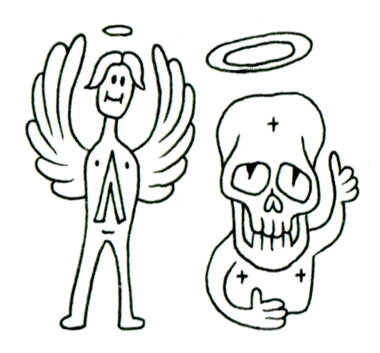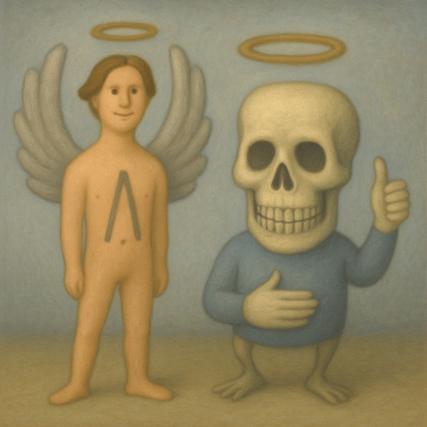 左右に並ぶのは、羽を持つ青年の天使と、親しげに微笑む頭蓋骨の人物。互いに光輪を頭上に浮かべながら、まるで会話の途中のような穏やかな構えを見せている。