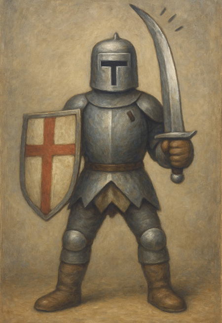 厚い甲冑に身を包み、十字の盾と湾曲した剣を構える騎士は、まるで時代や信条を超えて立ち尽くす象徴のようである。顔の見えない鉄仮面は、個人性を消し去り、匿名の「意志」そのものとしての存在を強調する。