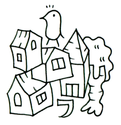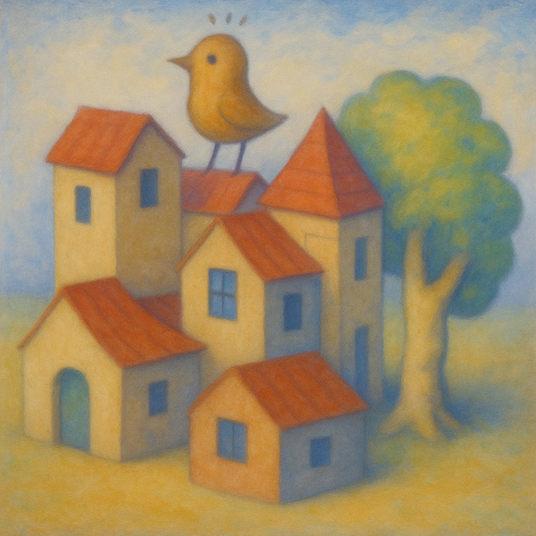 複数の家屋が寄り添うように密集し、その屋根の上に一羽の小鳥がちょこんと立っている。右手には丸く茂った一本の木が佇み、全体があたたかくもやわらかな調子で包まれている。