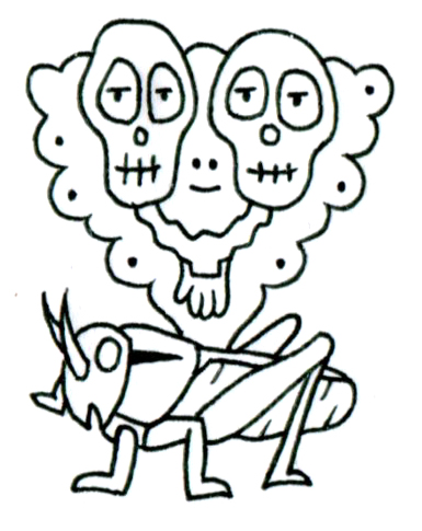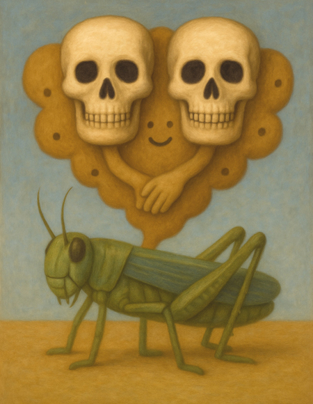 現実的な質感で描かれたバッタの上に、雲のような形状をした思念が浮かび、その中には二つの頭蓋骨と一つの微笑む顔が宿っている。奇妙に絡み合うその構成は、虫の見る夢、あるいは命の循環に潜む象徴的なヴィジョンのようでもある。