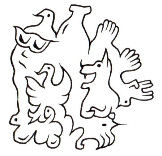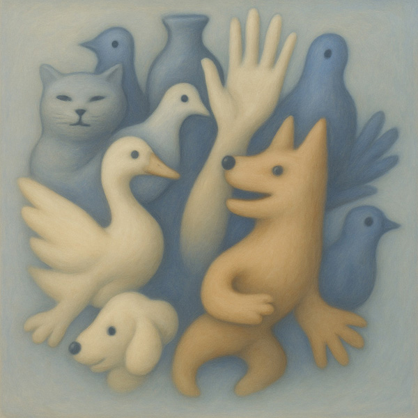 鳥、犬、猫、手、瓶、そして見分けのつきにくい曖昧なかたちたちが、円環を描くように穏やかに配置されている。それぞれの存在は、明確に描かれながらもどこか抽象的で、互いに交わることなく寄り添い合っている。
