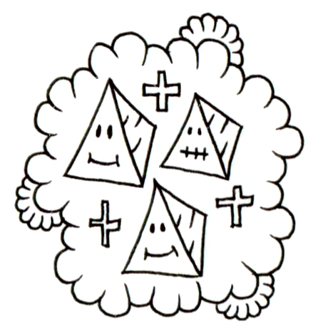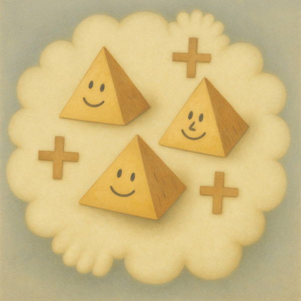 木目のような模様を持つ三体の三角錐が、綿雲のような柔らかい空間に浮かんでいる。各々に異なる表情が与えられ、中央には口元に縫い跡のような線が刻まれた存在もいる。周囲には十字が四つ、まるで静かな記号の呼応のように配置されている。