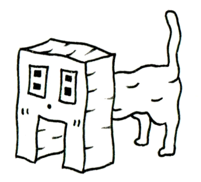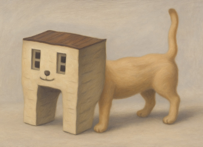 建物のような頭部を持つ猫のような存在が、静かな空間に立っている。顔のように配置された窓と玄関、そして自然につながる身体は、住居と生き物という本来交わらない存在を違和感なく融合させている。