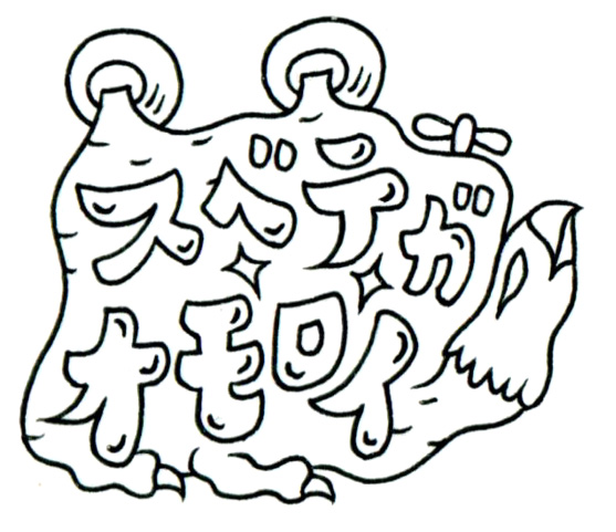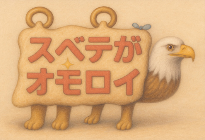 毛皮のような柔らかな板を背負った不思議な生物。その身体には赤く力強い文字で「スベテガオモロイ(すべてが面白い)」と記され、周囲には金色の星や青いリボン、足元にはしっかりとした四本の脚が支えている。右端からは白頭鷲の顔が覗き、ただのマスコットでも標語でもない、この存在がどこか崇高な使命を帯びていることを感じさせる。