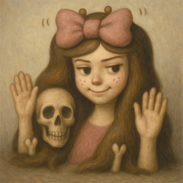 本作における少女の姿は、一見すると明るく無垢な表情を湛えているが、その長く流れる髪の内に潜む頭蓋骨が、死や喪失といった抑圧された主題を密やかに忍ばせている。