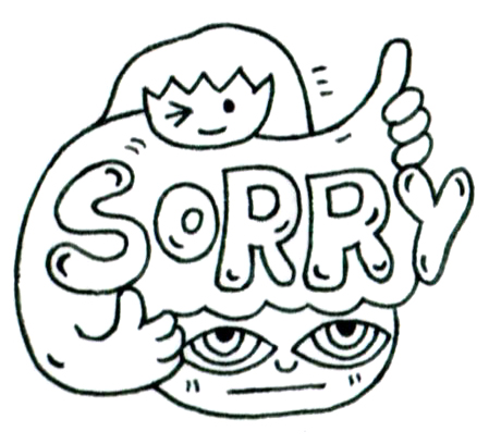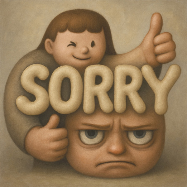 上部の人物は親しげな笑顔とサムズアップで謝罪を軽やかに演出する一方、下部の人物は明らかな不満と疲弊を表情に刻み、言葉と感情が一致しない現代的コミュニケーションの歪みを可視化している。