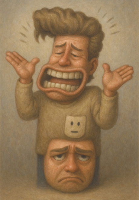 大仰な身振りと誇張された笑顔は、自己防衛的なパフォーマンスとしての理解不能を演じており、その胸に配置された無表情の顔、そして足元の沈んだ表情は、その演技の背後にある内的な困惑や不在感を示唆している。