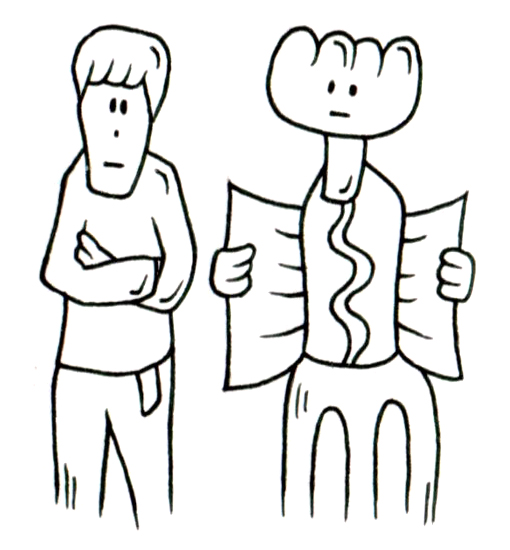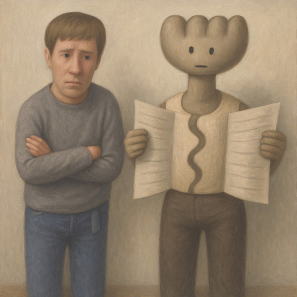 この作品は、人間と非人間的存在が共に一枚の紙(もしくは文書)を挟んで並び立つという奇妙な構図を通じて、「読むこと」「理解すること」の不確かさを描き出している。