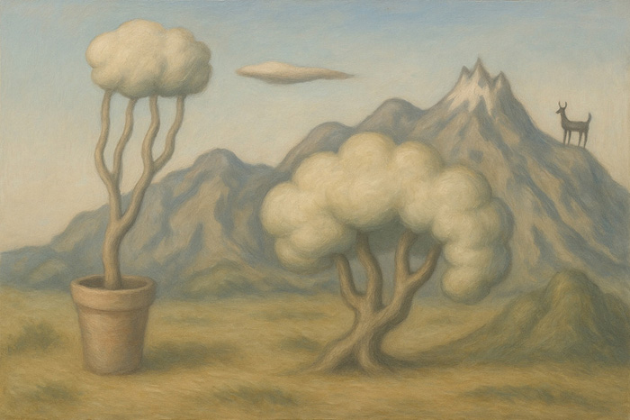 この作品は、現実と非現実のあわいに存在するような風景を描き出している。左には鉢に植えられた樹木、中央には地に根ざした樹があり、その対比が「自然と人工」「内と外」といった二項を想起させる。