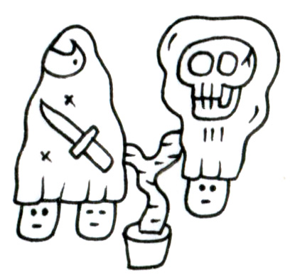 左の存在は月とナイフという二重の象徴を帯び、死と再生、あるいは感情の抑圧と暴力的衝動の交錯を暗示している。一方、右の存在は頭部がそのまま頭蓋骨へと変容しており、死そのもの、あるいは「見る死者」としての視線を獲得している。