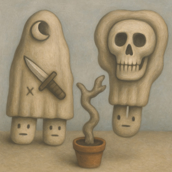 この作品は、まるで儀式のように整列する二体の覆面的存在と、中央に置かれたねじれた鉢植えによって構成されている。