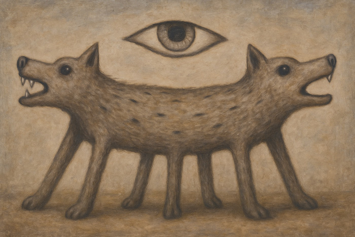 この作品は、一体でありながら対立する二つの意志を体現する獣の姿を通して、自己分裂と知覚の概念を探る。両端に向かって吠えるように開かれた二つの頭部は、それぞれ異なる方向性や衝動を象徴し、中心の胴体で無理やり一つに束ねられている。その上に浮かぶ単眼は、全体を俯瞰する意識の象徴であり、肉体が引き裂かれようとも意識は一つであることを示唆する。この構造は、理性と本能、統一と分裂、監視と混乱というテーマの緊張関係を映し出している。見ることと見られること、吠えることと沈黙のあいだに生まれる空間が、鑑賞者にその矛盾を問いかける。