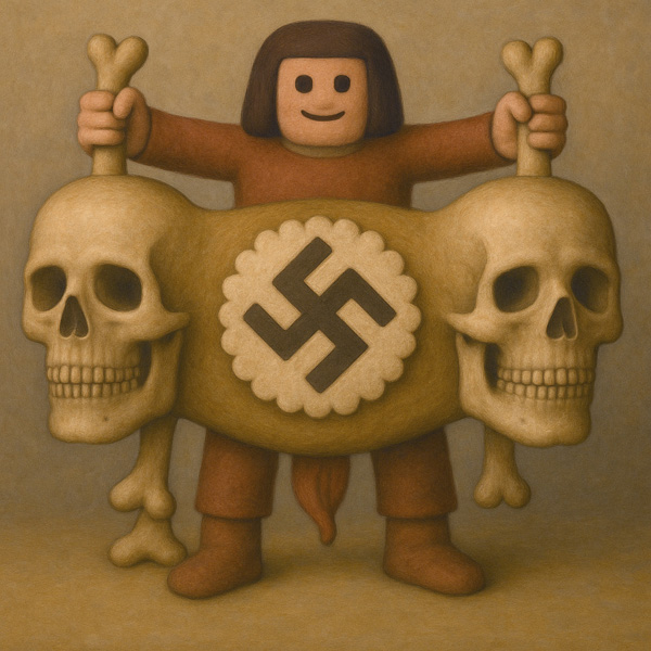 この作品は、ひとつの身体で両側の骸骨を掲げる人物を中心に構成されており、その幕の中央には鉤十字が刻まれている。古代的かつ制度的な形を持つこの記号は、ここでは歴史的文脈から切り離され、象徴そのものとして扱われている。人物の表情は無垢でありながら、その手にあるものの意味は極端に重く、意識の断絶が強調されている。左右対称の構図と、骨という不変の素材が与える永続性の印象は、「伝承」と「忘却」、「無知」と「再演」のあいだにある危うい均衡を浮かび上がらせる。意図された儀式性と不穏な均質性のなかで、この幕は問いかける——何が掲げられ、誰のために、どこへ向けてか。