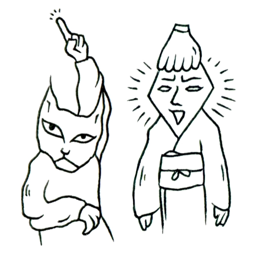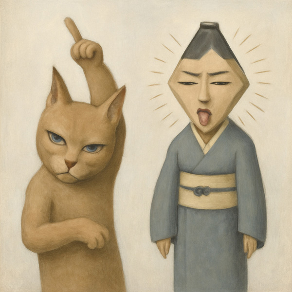 この作品は、二体の対照的な存在を並列に配置することで、教示と嘲笑、真面目さと軽薄さといった二項対立の構造をあらわにする。左の猫のような存在は、表情に威厳と冷静さをたたえながら、上方を指し示す仕草で何かを教えようとしている。対して右の人物は、和装をまといながらも舌を出し、光線のような線に囲まれてふざけた様相を見せる。