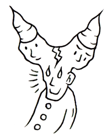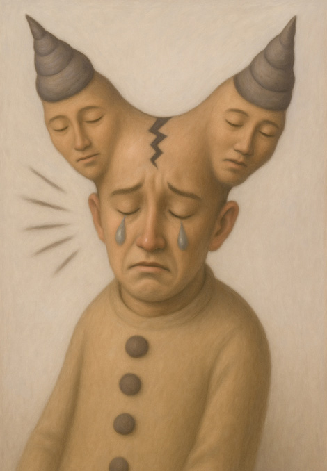 ひとつの胴体から分岐する三つの頭部は、それぞれ異なる心理状態の断片を表している。中央の顔は涙を流し、深い哀しみに沈んでいるが、そこから分かれるように左右に広がる二つの頭部は、静かに目を閉じ、内面に籠もった瞑想的な表情をたたえている。頭頂を走る亀裂は、統一された主体が裂ける瞬間を視覚化しており、内なる自己が分裂し、それぞれ独自の声を持ち始める過程を象徴する。