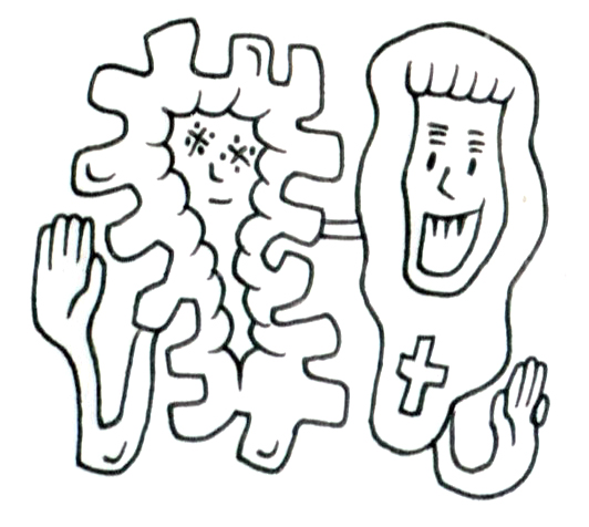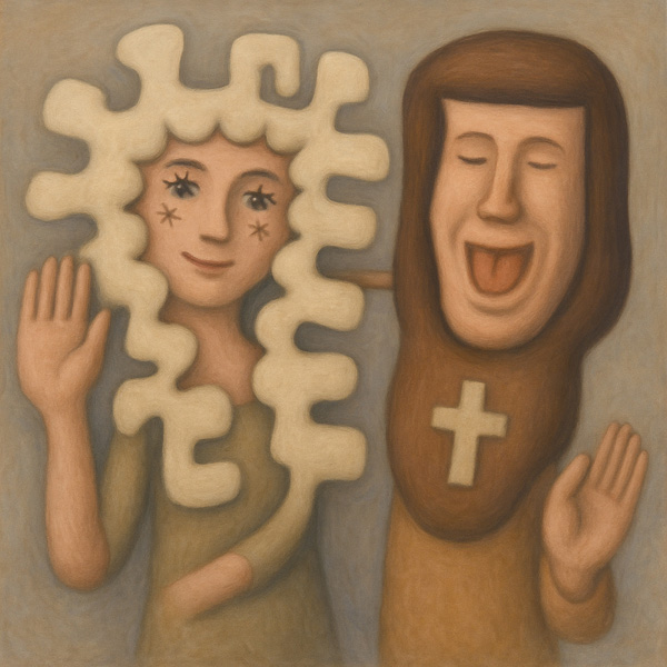 この作品は、明らかに異なる造形と表情をもつ二体の人物を、不可分な一体として描くことで、個と個の境界に揺らぎをもたらしている。左の人物は有機的な輪郭をもった髪型と星型の瞳を持ち、優美で幻想的な印象を与える。一方、右の人物は宗教的な図像を思わせる十字を胸に刻み、開いた口元と機械的な微笑により、やや人工的・偶像的な存在に見える。