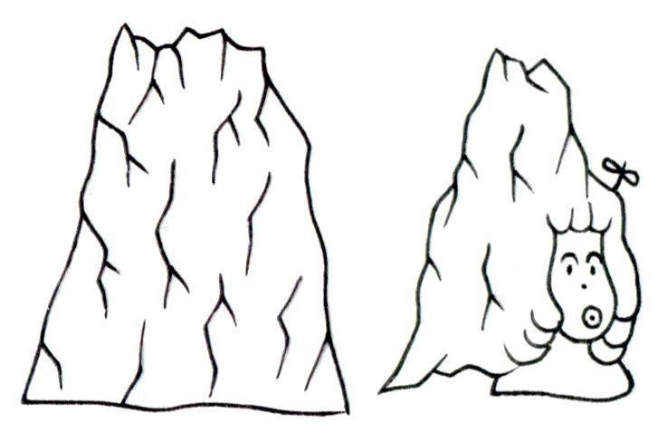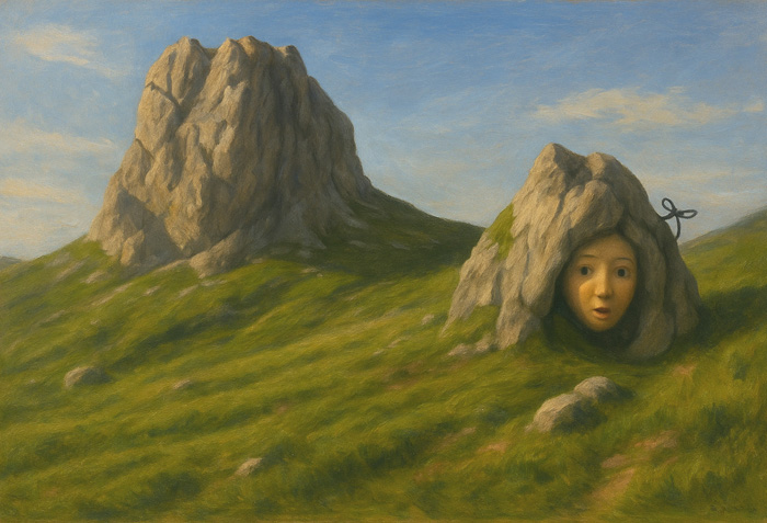 広大な草原にそびえる二つの岩山。そのうちのひとつは純粋な地形として、もうひとつは顔とリボンを持つ擬人化された存在として描かれている。両者は形状や質感を共有しながらも、生命と無機物の境界線に立っているようだ。特に右の岩に刻まれた驚きの表情は、自己の存在に対する気づきか、あるいは外部の視線に対する戸惑いを表している。