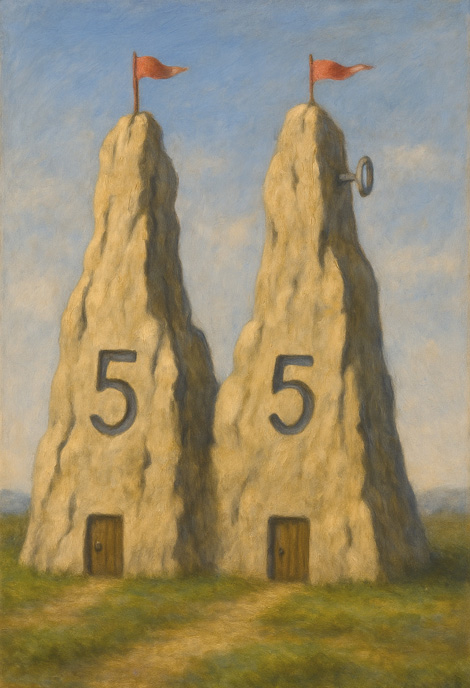 これは、同じ数値(評価や表層的価値)を持ちながらも異なる内実や構造をもつ二つの存在を象徴している。「5」が意味するものは普遍性であり、塔という垂直構造は到達・権威・分離を含意する。見る者は、どちらが「開かれるべき」塔なのか、あるいはどちらにも入るべきでないのかと問われることになる。