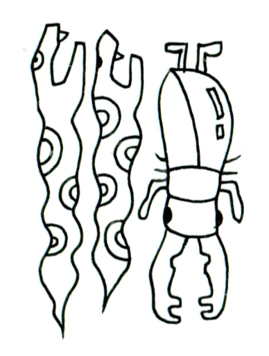 二本の波打つ有機体と一体の甲虫的な存在が、画面のなかで奇妙な均衡を成している。左側の存在は植物でも動物でもない、円環の紋様をもつ柔らかな生体のようであり、自己を模した記号の連続体のようにも見える。一方で右の存在は堅い殻をまとい、逆さにぶら下がるような姿勢で沈黙している。