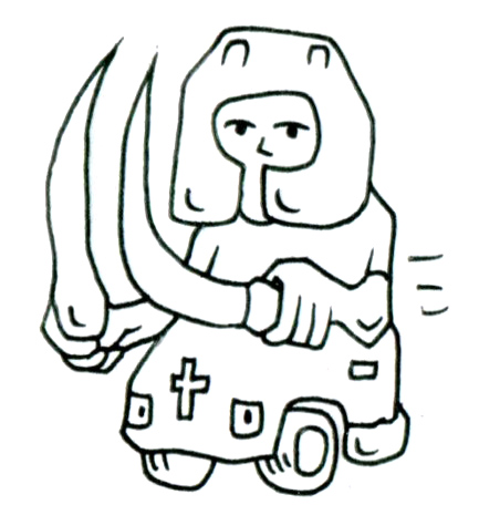 その身体は重厚で岩のような質感を持ち、車輪のような要素が下部に付随していることから、可動性を持ちながらも「動かないもの」としての象徴性も孕んでいる。そこには、生きた像、生身の彫刻とでも言うべき存在の矛盾が宿る。