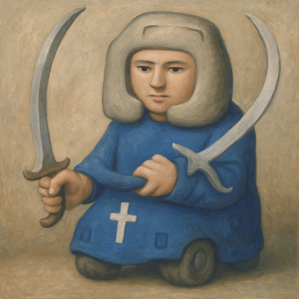 この作品は、青い衣装をまとった人物が両手に曲がった剣を携え、静かに正面を見つめる姿を描いている。剣はまっすぐではなく、あえて湾曲した形状で握られており、戦いのためではなく「儀式」や「意味」のために存在しているようだ。