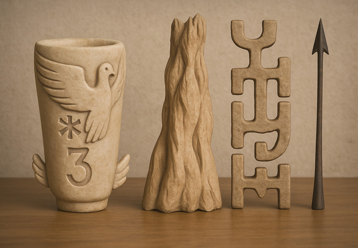 この作品には、意味を語る寸前でとどまるようなオブジェクト群が並ぶ。翼を持つ容器、尖った山のような塊、記号のような立体、そして矢。いずれも記憶の一部を象徴する断片のようであり、それぞれに物語の起点があるかのように佇んでいる。観る者はそれぞれの形状の間に見えない関係を想像し、ひとつの世界を構築することを促される。明確な意味を拒みながら、見る行為そのものに意味を委ねる構成である。