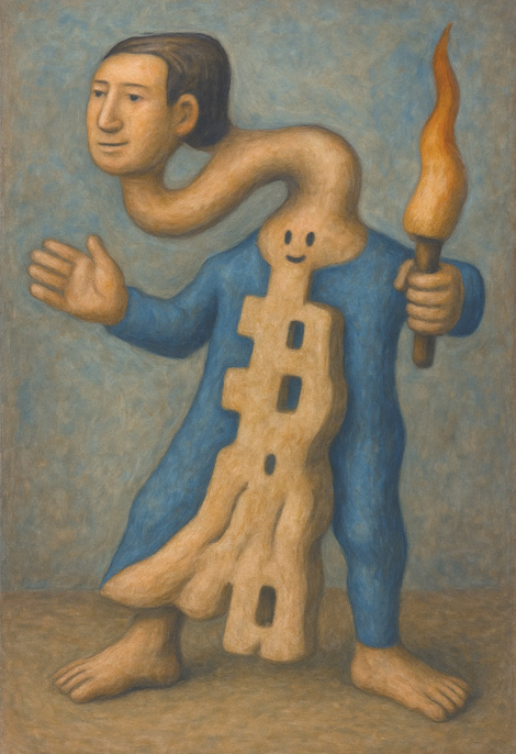 頭部が身体から伸びる腕の先にあるという奇妙な構造を持つ存在は、松明を携えてどこかを照らしている。しかしその目線の先には誰もおらず、導かれるべき存在は既に失われたのか、それとも初めから存在しなかったのか。身体の中に埋め込まれたもう一つの笑顔は、どこか自律した意志を感じさせ、外見と内面、あるいは自己と他者の境界が曖昧になっていくさまを象徴している。これは「導くもの」と「導かれるもの」が一体化した、孤独な巡礼者の肖像である。