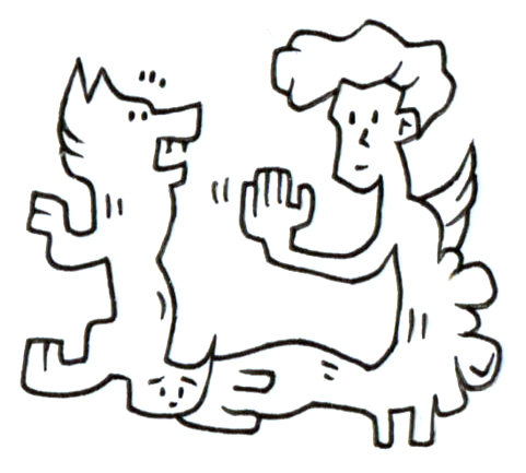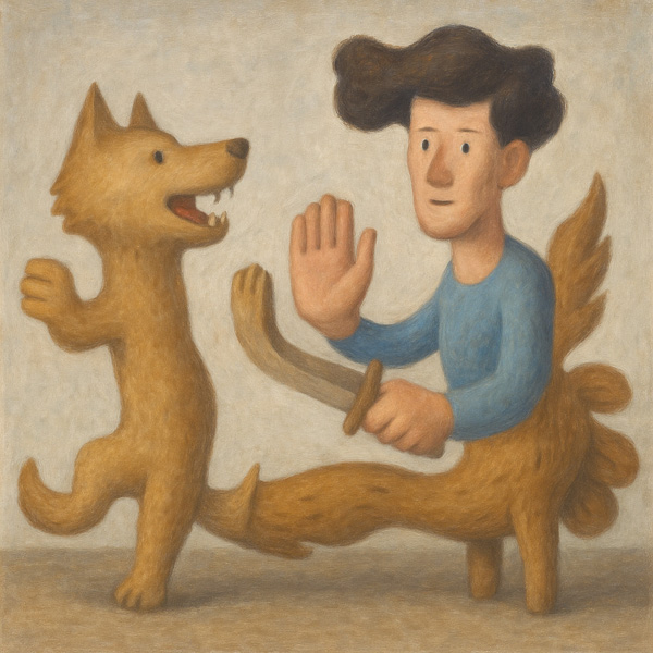 本作には、人間と犬のような姿が、一つの体を分かち合いながら向かい合う姿が描かれている。互いに手を差し出すその仕草は、接触か拒絶かの判断を観る者に委ねるものであり、関係性の曖昧さを象徴している。結合した身体と異なる表情は、個と共同体、衝突と調和の境界線を問う視覚的メタファーとも言える。現実にはありえない構造を写実的に描くことで、見る者の認識に揺さぶりをかける一作となっている。