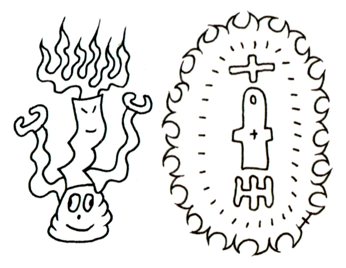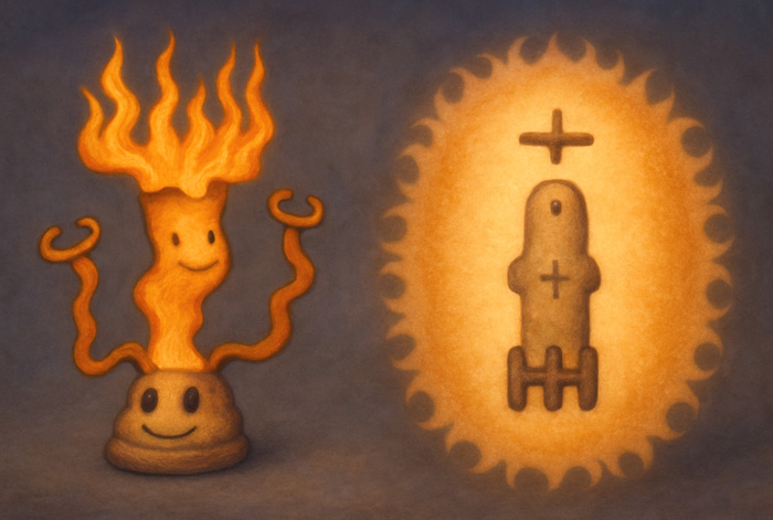本作は、対照的なふたつの存在を並置することで、生成と封印、生命と記号、意志と秩序といった概念の交錯を提示している。左の「炉」は笑顔を持ちながら燃え続ける有機的存在であり、生命の熱や魂の運動を象徴する。一方、右の楕円形の空間に浮かぶ図形群は、象徴的な印と幾何学の結晶が封じ込められた形象であり、静謐な秩序の中心にある不可侵性を示唆する。それぞれの存在が同じ空間にあるにもかかわらず交わらない構成は、互いに干渉しない二つの真理が並行して存在する世界観を仄めかす。