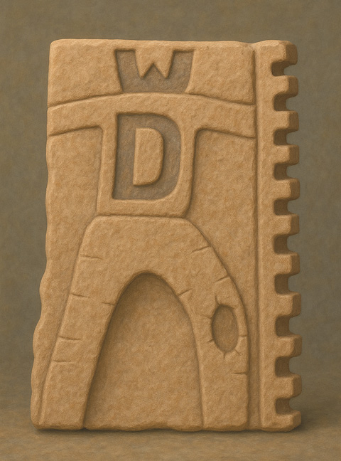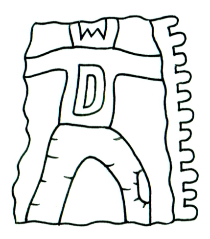 中央に浮かぶ石碑のような存在は、記号的な文字「W」「D」と、身体や建造物を想起させる形態を併せ持つ。まるで衣服のようでもあり、都市の地図の一部のようでもあるこの構造体は、「入り口」と「印章」を同時に象徴する。右端の刻み模様は製本の背を想わせ、記録媒体としての性格を帯びるが、中央のアーチ状の開口部は向こう側への通路を連想させる。