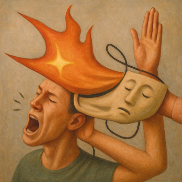 本作は、顔の一部のように密着した仮面が、炎を伴って剥がれ落ちる瞬間を捉えている。左側の人物の叫びは、苦痛であると同時に、長く押し込めていた感情の放出のようにも見える。一方で、右側の手は何かを「止める」ようでもあり、あるいは「差し出している」ようでもある。