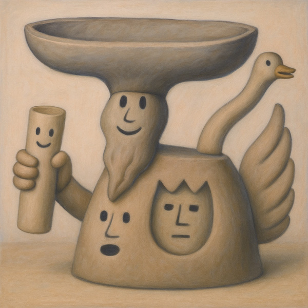 この作品は、一見ユーモラスな表情をもった壺のような存在に、顔・手・巻物・翼・鳥の首といった有機的パーツが複数組み込まれている。それらは一つの生命体を構成しているかのようであり、しかしどのパーツも完全には繋がりきっていない。
