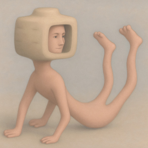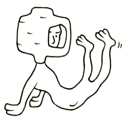 この作品に描かれているのは、身体の中央に三本の脚をもち、頭部が器状の構造体になっている奇妙な存在である。その器には顔が内側から浮かび上がっており、まるで「外を見る内なる意識」がそこに宿っているかのようだ。