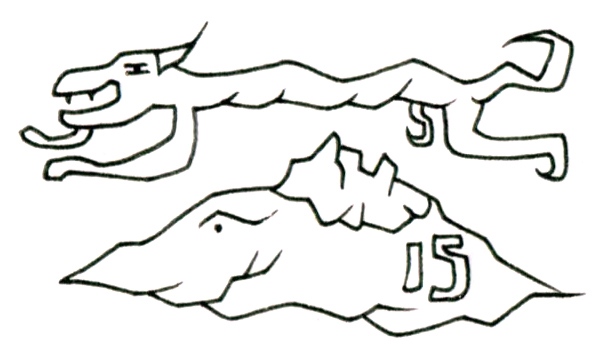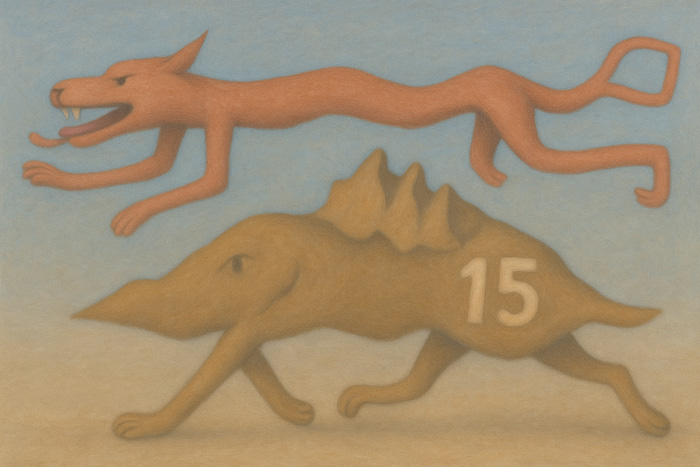 上の獣の体は波打つように流動的で、舌を出した口元は野性と自由の力を誇示している。一方、下の存在は山と一体化したような形態をしており、背に「15」の文字を刻まれていることから、番号付けされた記号的な存在として管理されていることを示唆している。