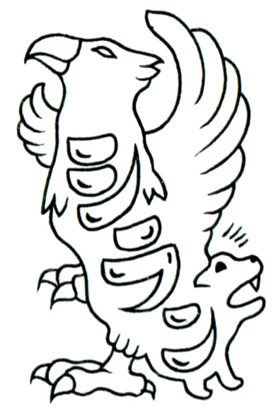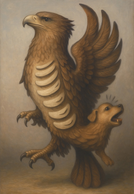 この作品に描かれているのは、一つの胴体を共有しながら、鳥と獣という異なる二つの存在が垂直に結びついた異形の生命体である。上部には堂々と翼を広げる猛禽類の姿があり、下部には不安げに叫ぶ犬のような存在が繋がっている。胴体に沿って並ぶ弧状の模様は、肋骨であると同時に、この生物が一つのリズムを共有していることを暗示する視覚的メトロノームのようでもある。