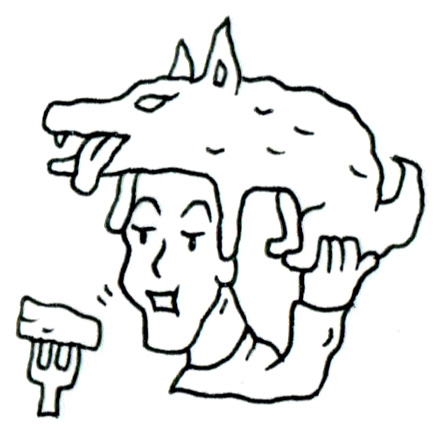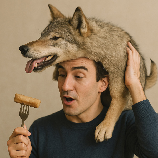 人物は左手にフォークを持ち、その先に小さな何かを掲げている。それは食べ物か、記号か、あるいは生への問いの断片かもしれない。狼の口からは舌が垂れ下がり、動かぬその皮膚は、被られながらなお何かを主張しているようにも見える。