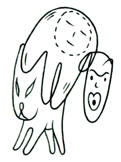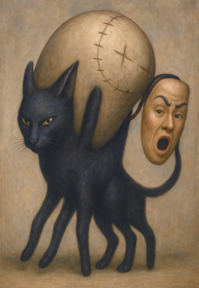 この作品は、六本足の猫のような存在と、その背に縫い込まれた球体、そして吊るされた人面の仮面という三つの異質な要素によって構成されている。いずれも異なる質感をもちながら、ひとつの生き物として合成されており、自然と人工、動物と人間、外側と内側といった対立項が不安定な均衡で同居している。